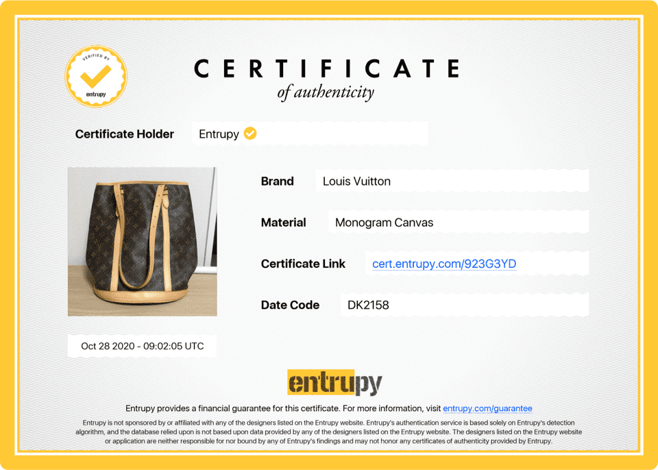 Each genuine handbag is accompanied by an Entrupy Certificate of Authenticity. We also encourage our sellers to provide additional documentation and accessories, such as receipts, original boxes, dust covers, and certificates of authenticity, to ensure a seamless and trustworthy experience